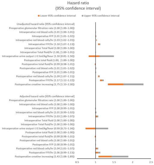 The unadjusted and adjusted hazard ratios (aHRs) of major and kidney-related variables (preoperative GFR, intraoperative urine output ≤ 0.5 mL/kg/h, and postoperative creatinine increase) for 72-h postoperative pulmonary edema both with and without hypoxemia are shown in Figure 1 and Figure 2, respectively. The postoperatively administered total fluid (aHR: 1.00; 95% confidence interval CI: 1.00–1.00; p < 0.001) and the postoperative RBCs per hour (aHR: 1.03; 95% CI: 1.01–1.05; p = 0.013) showed significant associations with postoperative pulmonary edema. The postoperatively administered total fluid (aHR: 1.00; 95% CI: 1.00–1.00; p = 0.005) and the postoperative RBCs per hour (aHR: 1.04; 95% CI: 1.01–1.07; p = 0.024) also showed significant associations with postoperative pulmonary edema with hypoxemia. The intraoperative FFP per hour was significantly associated with postoperative pulmonary edema (aHR: 1.03; 95% CI: 1.00–1.06; p < 0.042), but the other major variables were not (Figure 1 and Figure 2; Appendix A, Table A1 and Table A2).