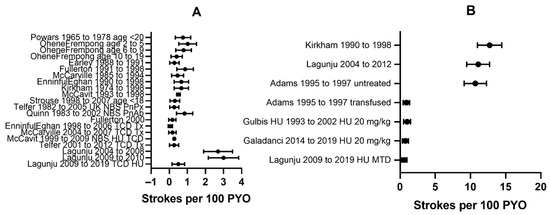 Alongside the introduction of TCD, the increasing use of hydroxyurea in children with symptomatic SCD in the USA may have been one reason for the reduction in stroke incidence after 1998 [37]. The TCD With Transfusions Changing to Hydroxyurea (TWiTCH) study showed that for children with Abnormal TCD but normal magnetic resonance angiography (MRA) who had been transfused for a year, substituting hydroxyurea was not inferior to continuing chronic transfusions [122]. Subsequently a significant proportion of children with Abnormal TCD in the USA and Europe have switched, which raises the possibility that hydroxyurea might be a cost-effective alternative to transfusion for primary prevention of stroke in children with SCD and Abnormal TCD, particularly as the available data shows that hydroxyurea reduces TAMMV [119,123,124]. In a cohort study of 34 patients with abnormal TCD in Belgium treated with hydroxyurea 20 mg/kg/day, for those with abnormal TCD in the high stroke risk group, the incidence of stroke was 1 per 100 PYO [124], while in a feasibility single arm trial of fixed-dose 20 mg/kg hydroxyurea in northern Nigeria, the rate was 0.76 per 100 PYO [117]. The use of maximum tolerated dose in those with abnormal TCD in Ibadan reduced the overall incidence of stroke from 3 to 0.07/100 PYO or 0.08/100 PYO for those followed for more than 5 years [104] (Figure 1A), with incidences of 0.27/100 PYO in those with conditional or abnormal TCD treated with hydroxyurea and 0.5/100 PYO in those with abnormal TCD (Figure 1B). These figures for incidence are all less than the expected rate of 10.7 strokes per 100 PYO in the untreated arm of the STOP trial [117] (Figure 1B). In a randomised trial comparing 10 mg/kg and 20 mg/kg fixed dose hydroxyurea, the incidence rates of stroke were also both lower than the untreated arm of the STOP study and were not significantly different from each other [125,126].