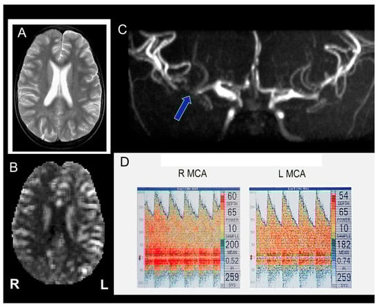 Magnetic resonance imaging (MRI) and transcranial Doppler) (TCD) in an 11 year old child with headache after a chest crisis. (A) T2-weighted MRI was normal but (B) there was reduced cerebral blood flow throughout the right hemisphere and posteriorly on the left. (C) Magnetic resonance angiography (MRA) showed signal dropout in the middle cerebral arteries, worse on the right, which manifest as (D) Abnormal and Conditional time averaged mean of the maximum velocity on the right and left respectively. He was transfused for a year and both MRI and TCD returned to normal.