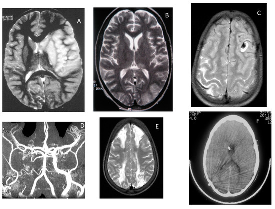 Coma in SCD may be due to intracranial haemorrhage (Figure 3C) [135,160], although extensive middle cerebral artery infarction with oedema and midline shift (Figure 3A) [167], posterior reversible encephalopathy syndrome (Figure 3B), which may progress to borderzone infarction (Figure 3E), and venous sinus thrombosis (Figure 3F) [137] can also have a similar presentation. Other symptoms of covert (‘silent’) cerebral infarction include dysphasia, difficulty with gait (Figure 3D) [168] and ‘soft neurological signs’ [160,169,170,171].