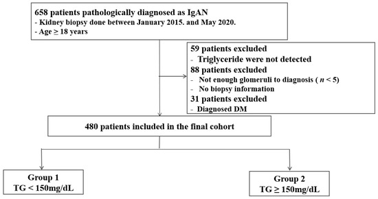 This study is a cross-sectional review of a multi-center cohort of patients who underwent kidney biopsies at eight university hospitals affiliated with the College of Medicine of the Catholic University of Korea between January 2015 and May 2020 and who were diagnosed with IgAN. We excluded patients aged <18 years, those diagnosed with diabetes mellitus, those with no available serum triglyceride and those whose histologic information did not adhere to the standard description form or indicate sufficient glomeruli for diagnosis. A total of 480 patients were enrolled in the final cohort. The patients were divided into two groups according to the following diagnostic criteria: group 1—TG <150 mg/dL; group 2—TG ≥150 mg/dL [4,5,6]. Figure 1 shows the flow chart for this study population.