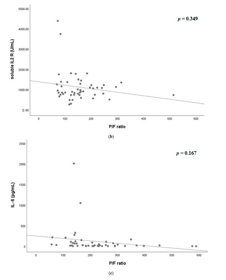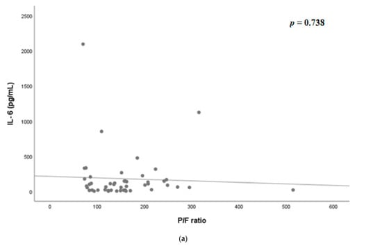 Figure 2 shows the scatter plot of PaO2/FiO2 ratio, IL-6, and sIL-2R on Days 0 and 7. On Day 0, there was no significant correlation between IL-6 and PaO2/FiO2 ratio (p = 0.738, Figure 2a), as well as sIL-2R and PaO2/FiO2 ratio (p = 0.340, Figure 2b). On Day 7, however, sIL-2R was significantly correlated with P/F ratio (p = 0.013, Figure 2d); however, IL-6 was not significantly correlated (p = 0.167, Figure 2c).