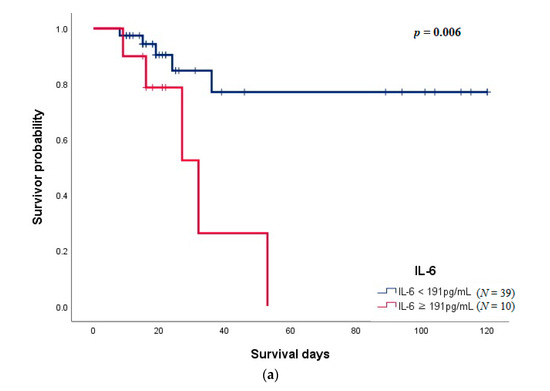Figure 3 shows the Kaplan–Meier survival curve of IL-6 and sIL-2R. The cut-off value of IL-6 obtained from the receiver operating characteristic curve was 191 pg/mL (Area Under the Curve, AUC: 0.687, sensitivity: 50.0, specificity: 87.2), and it was significantly related to a higher mortality rate (p = 0.006, Figure 3a). The patient group with sIL-2R above 1083 U/mL (AUC: 0.718, sensitivity: 80.0, specificity 71.8) was significantly associated with mortality (p = 0.040, Figure 3b).