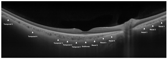 CT measurements were conducted in the same manner as described in our previous report [23]. For the 16-mm HD spotlight scan, CT was measured from the outer part of the hyperreflective line (corresponding to the retinal pigment epithelium RPE) to the inner surface of the sclera, using a caliper and built-in review software. Measurements were made at 12 points: 3 points at 900-µm intervals from the nasal optic disc margin (nasal points 1–3; nasal peripapillary area), 1 point at the subfovea, 6 points at 900-µm intervals from the fovea to the nasal and temporal areas (nasal points 4–6; temporal points 1–3; macular area), and 2 points at 2700-µm intervals from temporal point 3 (temporal points 4 and 5; peripheral area) (Figure 1). All scans were assessed by two investigators (M.S.K. and Y.K.W.). The reproducibility of the measurements was evaluated based on the coefficient of variation (CV) and intraclass correlation coefficient (ICC). Mean values of two measurements were used for the analysis.