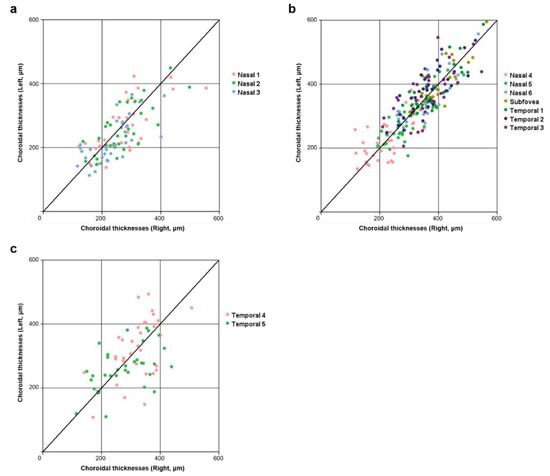 To measure CT in the nasal peripapillary and peripheral areas in subjects with uncomplicated pachychoroid, wide-field imaging is required. Several studies measured peripheral choroidal CT using wide-field imaging [23,29,30,32,33]. However, to our knowledge, this is the first study to investigate interocular differences in CT in nasal peripapillary and peripheral areas in subjects with uncomplicated pachychoroid. In this study, the correlation coefficients of CT in the nasal peripapillary and peripheral areas were lower than in the macular area (except for nasal point 4 and temporal point 3), thus demonstrating that CT symmetry in the nasal peripapillary and peripheral areas is generally lower than in the macular area. However, the reason for these differences is not clear. In our previous study [23], CT measurements were compared between pachychoroid and “normochoroid eyes” using wide-field SS-OCT. Even in pachychoroid eyes, pachyvessels were sometimes absent from the nasal peripapillary and peripheral areas, leading to smaller than expected CT values. This may partly explain the greater interocular CT variation in nasal peripapillary and peripheral areas compared to the macular area.