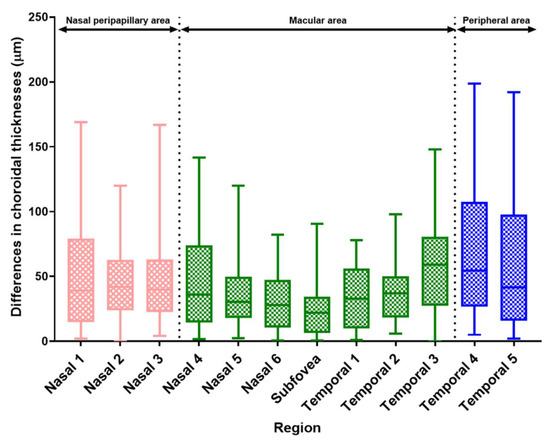 Figure 3. Box and whisker plots (2.5–97.5 percentile) of absolute interocular differences in CT according to region. CT differences were generally greater in the nasal peripapillary and peripheral areas than in the macular area. CT: choroidal thickness.
