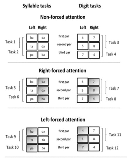 Each of these four dichotic tests was applied under non-forced, forced-right, and forced-left conditions, totaling 12 different tasks (Figure 1).