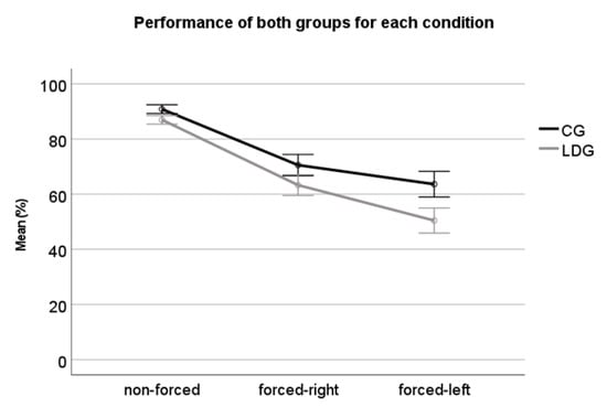 The results indicated an overall “group effect” (F(1,43) = 18.93, p < 0.01, ηp2 = 0.306), with the LDG presenting less accurate responses than the CG. There was also a “condition effect” (F(1,43) = 464.4 p < 0.01, ηp2 = 0.91), with post-hoc analysis (Bonferroni) indicating a significant better performance for non-forced condition (p < 0.01), followed by forced-right (p < 0.01) and forced-left (p < 0.01). An interaction between group x condition (F(1,43) = 9.93, p < 0.01 ηp2 = 0.18) was also detected, which is shown in Figure 2.