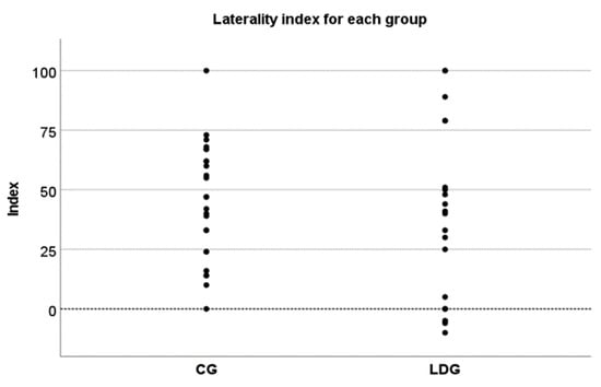 An overall ear effect was also observed (F(1,43) = 52.4, p < 0.01, ηp2 = 0.550), with greater scores for the right ear. This effect was observed regardless of the group (F(1,43) = 52.4, p < 0.01, ηp2 = 0.550), which indicates a similar “right ear advantage” (REA) for all participants. The degree of magnitude of the right ear advantage was also investigated for each group through the laterality index. ANOVA revealed no group effect (F(1.43) = 0.692, p = 0.41), demonstrating an overall similar magnitude of REA regardless of group. Despite that, four participants in the LDG presented left ear advantage, which was indicated by the negative number (Figure 3).