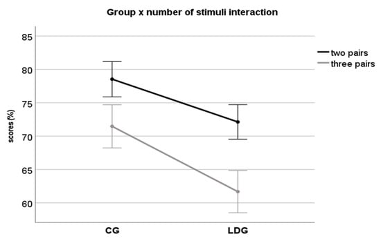 Interaction between group × “number of stimuli” variable. Although the LDG has had worse performance than CG for tests with 2 and 3 pairs, the difference between group was larger for 3 pairs.