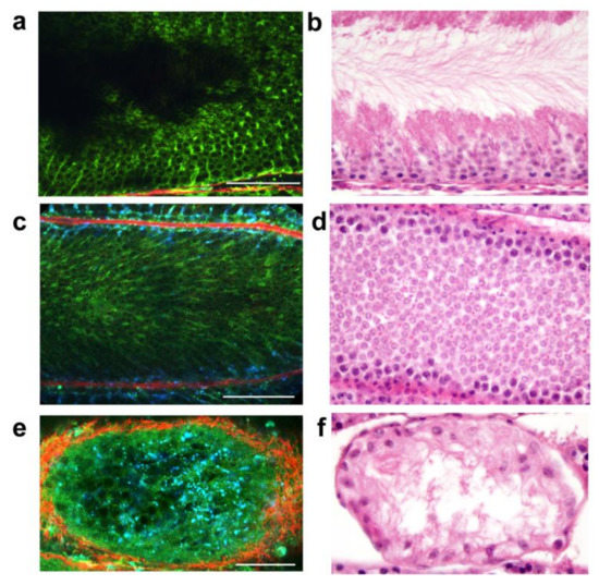 Varying seminiferous tubule histology patterns from rat testis procured using an ischemia hypothermia model (multiphoton microscopy panels (a,c,e); fixed in Bouin’s solution panels (b,d,f). Panels (a,b) show seminiferous tubules with spermatogenesis. Panels (c,d) demonstrate tubules with maturation arrest. Panels (e,f) illustrate tubules with a Sertoli cell only pattern. (Reprinted with permission from [49]. Copyright 2011 American Urological Association).