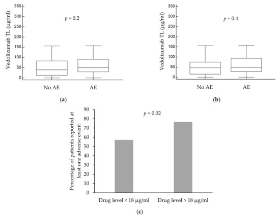 Chicago/Turabian StyleVeisman, Ido, Oranit Barzilay, Liora Bruckmayer, Ola Haj-Natour, Uri Kopylov, Rami Eliakim, Shomron Ben-Horin, and Bella Ungar. 2021. "Association of Infliximab and Vedolizumab Trough Levels with Reported Rates of Adverse Events: A Cross-Sectional Study" Journal of Clinical Medicine 10, no. 18: 4265. https://doi.org/10.3390/jcm10184265
