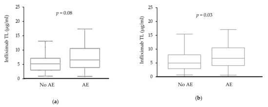 The median of infliximab TL was 5.3 μg/mL (IQR 3.1–9.1 μg/mL) in the study cohort. Higher infliximab levels were numerically associated with the occurrence of at least one AE, although statistical significance was not reached (median trough levels among patients with at least one reported AE versus those not reporting an AE: 5.7 and 4.3 μg/mL, IQR 3.1–9.6 and 2.2–6.2 μg/mL, respectively, p = 0.08, Figure 1a). Nevertheless, when excluding fatigue and abdominal pain, higher infliximab levels were statistically associated with the occurrence of at least one AE (median trough levels among patients with at least one reported AE versus those not reporting an AE: 6 and 4.3 μg/mL, IQR 3.4–9.8 and 2.3–7.0 μg/mL, respectively, p = 0.03, Figure 1b). Six patients developed anti-infliximab antibodies (infliximab levels: median = 0.1 μg/mL, range = 0.04–5.7 μg/mL; antibodies levels: median = 4.3 μg/mL, range = 2.6–7.2 μg/mL), four (66%) of whom reported at least one AE.