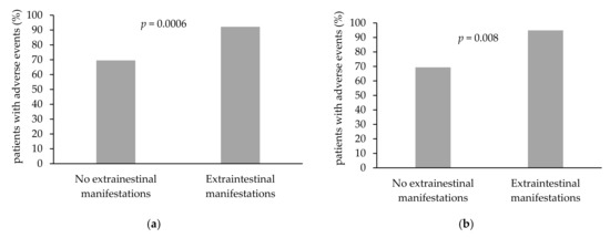 Patients with known extraintestinal manifestations (EIM) demonstrated more AEs, (71/77, 92.2% for infliximab; 37/39, 94.9% for vedolizumab) compared to patients without known EIM (p = 0.0006 and p = 0.008, as in Table 2, Figure 3a,b, for infliximab and vedolizumab, respectively). Parameters such as age, disease duration, IBD type, disease location, disease phenotype, previous surgery, concomitant immunomodulatory therapy, concomitant steroid therapy, previous biological treatment, and smoking status were not identified as risk factors for experiencing AEs in both infliximab and vedolizumab-treated patients (Table 2). Among infliximab-treated patients, female patients reported adverse events more often than men (n = 75, 86% versus n = 61, 73.5%, p = 0.04, Table 2, Figure 3c). Nevertheless, among vedolizumab-treated patients, gender was not associated with incidence of AE: 34 (82.9%) of the female patients versus 37 (78.7%) of the male patients reported at least one AE (p = 0.6, Table 2, Figure 3d). There was no difference between males and females in terms of drug levels in both infliximab and vedolizumab-treated IBD patients (p = 0.8 and p = 0.1, respectively).