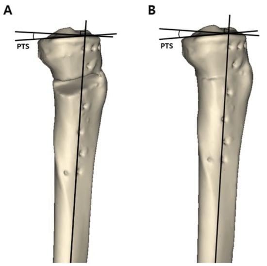 Measurement of the posterior tibial slope in a three-dimensional reconstructed model. The line perpendicular to the bisecting line of the tibial shaft and medial tibial plateau line was drawn on a true lateral view. The angle formed by these two lines was defined as the posterior tibial slope. (A) Postoperative posterior tibial slope. (B) Preoperative posterior tibial slope measured in the restored original preoperative tibia model. posterior tibial slope = posterior tibial slope.