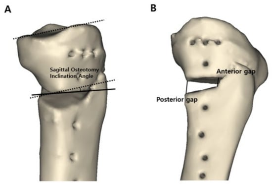 Three major variables were measured in the 3D reconstructed model: (1) the preoperative and postoperative posterior tibial slope, (2) osteotomy inclination angle relative to the medial tibial plateau line in the sagittal plane, and (3) anterior and posterior opening gap and the ratio of these two osteotomy gaps. To measure the posterior tibial slope and osteotomy inclination angle in the sagittal plane, the 3D reconstructed model was aligned in a true lateral position. The true lateral position of the tibia was obtained by manipulating the femoral lateral and medial condyles to be superimposed on the basis of the method presented in a previous study [24]. When measuring variables, the 3D model of the femur was made invisible for convenience. After the true lateral view was completed, this view was captured because these two lines could not be located on the same plane. The posterior tibial slope was measured on the captured 3D true lateral view as previously described [25,26]. The line perpendicular to the bisecting line of the tibial shaft and the medial tibial plateau line were drawn. The angle formed by these two lines was defined as the posterior tibial slope (Figure 2A). To measure the preoperative original posterior tibial slope, the original tibia model was obtained by removing the osteotomy gap of the proximal tibia. The proximal and distal parts of the tibia were combined to the preoperative original tibia by rotating the proximal segment using the lateral cortex as a hinge. The original posterior tibial slope was measured in the same way (Figure 2B). To measure the osteotomy inclination angle in the sagittal plane, a medial tibial plateau line and a sagittal osteotomy line on the anteromedial aspect of the lowermost part of the proximal tibia segment were drawn on the captured 3D true lateral view. The angle formed by these two lines was defined as the osteotomy inclination angle (Figure 3A) [19]. When the front of the osteotomy line was inclined downward with respect to the line parallel to the medial tibial plateau, it was classified as positive, and if it was inclined upward, it was classified as negative. The osteotomy gap ratio was defined as the ratio between the distances of the anterior opening gap and posterior opening gap in the 3D reconstructed model. The anterior opening gap was measured at the medial edge of the frontal plane osteotomy site. The posterior opening gap was measured at the most prominent posteromedial edge of the tibia (Figure 3B) [17,27]. The osteotomy gap ratio (%) was calculated by dividing the anterior opening gap by the posterior opening gap and multiplying by 100. Measurements of variables were conducted by two independent orthopedic surgeons who did not participate in the MOWHTO and were blinded to the patients’ information to increase their reliability. The mean of the two numerical values was used.
