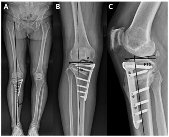 In addition to the measurement of variables in the 3D reconstructed model, the preoperative and postoperative hip–knee–ankle angle, weight-bearing line ratio, and posterior tibial slope were also measured using plain radiographs. Plain knee radiographs of the anteroposterior and lateral views were taken preoperatively and postoperatively on the day of the operation. Full-length lower extremity standing radiographs were also taken preoperatively and 6 months postoperatively. The hip-knee-ankle angle was measured on the full-length lower extremity standing radiograph with the first line from the femoral head center to the tibial spine center and the second line from the tibial spine center to the center of the superior articular surface of the talus. The angle made by the intersection of these two lines was defined as the hip–knee–ankle angle (Figure 4A) [28]. The weight-bearing line ratio was measured with the weight-bearing line and tibial plateau line. The weight-bearing line was drawn from the center of the femoral head to the middle point of the superior articular surface of the talus on the full-length lower extremity standing radiograph. A tibial plateau line from the medial edge to the lateral edge of the proximal tibia on the joint surface was drawn thereafter. The weight-bearing line ratio was calculated as the ratio of the distance from the medial edge of the proximal tibial plateau to the intersection of the weight-bearing line and the distance from the proximal tibial plateau line to the entire length of the proximal tibial plateau line. The medial tibial edge was 0%, and the lateral tibial edge was 100% (Figure 4B) [28]. Posterior tibial slope was also measured on the lateral view of the plain radiograph taken in a true lateral position [29]. The dots were marked 7 cm and 12 cm below the joint line on the anterior and posterior cortex of the tibia. Two lines connecting the two dots marked at 7 cm and 12 cm were drawn, and a line passing through the midpoint of these two lines was defined as the tibial shaft axis. The posterior tibial slope was measured as the angle formed by the line perpendicular to the tibial shaft axis and medial tibial plateau line (Figure 4C). These variables were also measured by two independent orthopedic surgeons. Measurements on the plain radiographs were made without knowing the measured values in the 3D model for each patient. The mean of the two numerical values was used.