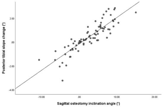 According to the Pearson correlation analysis, there was a significant correlation between two parameters, namely osteotomy inclination angle in sagittal plane and opening gap ratio and posterior tibial slope change. The Pearson correlation coefficient (r) was 0.875 (p < 0.001) for the osteotomy inclination angle (Figure 5) and 0.233 (p = 0.038) for the gap ratio (Table 5). According to the subsequent multivariate regression analysis to identify significant independent variables affecting posterior tibial slope change, the only significant factor among the variables was the osteotomy inclination angle in the sagittal plane (β coefficient = 0.216, p < 0.001) (Table 6).