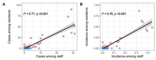 A strong positive correlation existed between residents and staff members for both the number of COVID-19 cases (r2 = 0.77, p < 0.001) and their incidences (r2 = 0.78, p < 0.001) (Figure 1). Results were similar in sensitivity analysis (Supplementary Figure S2).