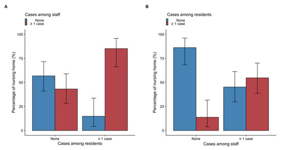 All but four nursing homes with COVID-19 cases among their residents reported cases among their staff members (85.1% (95CI, 66.2% to 95.8%)), while half (43.1% (95CI, 28.3% to 59.0%)) of nursing homes without cases among residents reported cases among staff members (Figure 2A and Supplementary Table S1).
