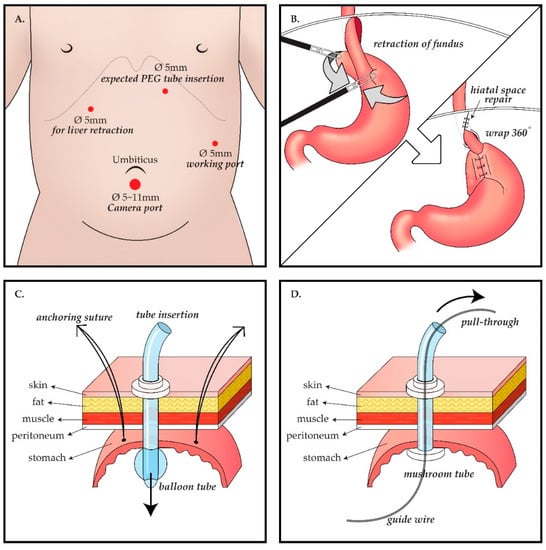- Perger, L.; Watch, L.; Weinsheimer, R.; Fahl, J.; Azzie, G. Laparoscopically supervised PEG at time of Nissen fundoplication: A safe option. J. Laparoendosc Adv. Surg. Tech. A 2008, 18, 136–139. [Google Scholar] [CrossRef] [PubMed]