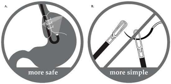 Advantages of the hybrid surgical procedure. (A) Safe: During surgery, operator can check tightness and status of fundoplication directly with J turn of the endoscope in stomach. Therefore, complications associated with too tight or too loose wrapping are prevented. (B) Simple: As anchoring sutures between stomach and abdominal wall and purse-string sutures are not needed during laparoscopic-assisted percutaneous endoscopic gastrostomy tube insertion, the procedure becomes simpler and easier.
