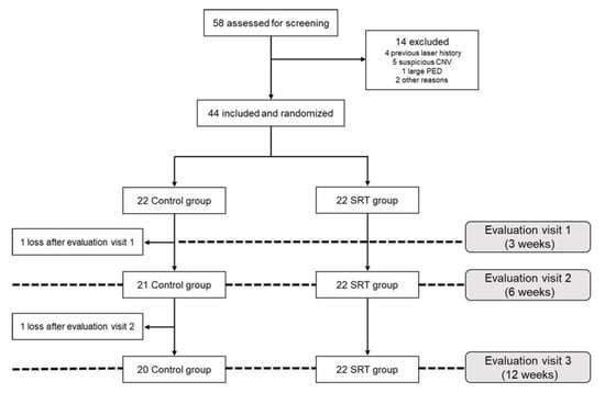 For sample size calculation, we considered that the SRT treatment group would be superior to the control group in terms of the percentage of participants who showed complete SRF resolution after 6 weeks. The level of significance was 5% with a one-sided test, power was 80%, and the superiority margin was set to zero according to the European Medicines Agency guidelines. The rate of SRF resolution was measured in the range of 0.71–1.0 in the SRT and at 0.4 in the control group [,,,]. Calculations showed that it was necessary to register at least 20 subjects in each group, assuming a dropout rate of 10%. Thus, 44 subjects were enrolled.