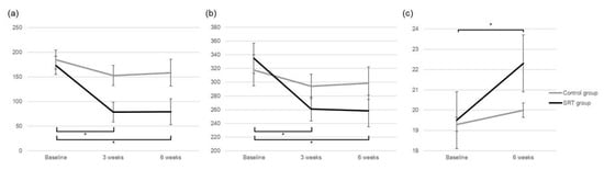 Comparison of change in (a) subretinal fluid height, (b) central macular thickness, and (c) mean retinal sensitivity between the SRT group and control group during the 6-week follow-up period. * p < 0.05.