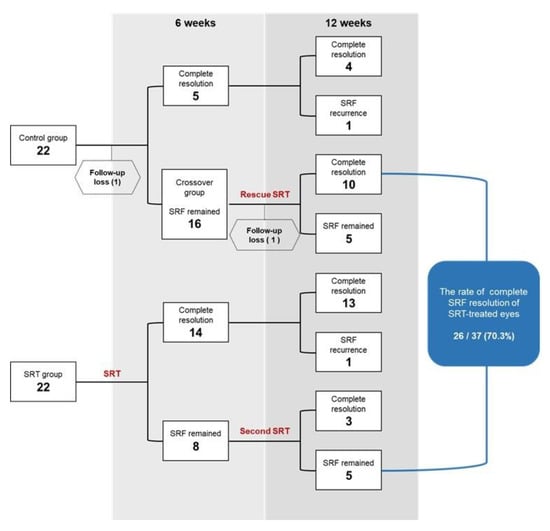 Flow-chart representing the rate of complete resolution of subretinal fluid (SRF) in the SRT group and control group during the 12-week follow-up period.