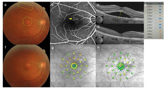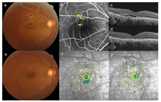 Case 2: A 45-year-old man presented with an 8-month history of blurred vision in the right eye. After the 6-week observation period, subretinal fluid was still observed at the macula on color fundus photography. The area of 13 test spots (yellow rectangular) and 15 rescue treatment spots (yellow circles) were invisible (a). Three focal leakages (yellow arrows) were shown on fundus fluorescent angiography (b). Subretinal fluid and pigment epithelial detachment was observed on optical coherence tomography (OCT) before rescue with selective retina therapy (SRT) (c). At 6-weeks post-SRT, subretinal fluid was completely resolved on OCT (d). No SRT spots were visible on fundus photography (e). Mean retinal sensitivity (20 dB) on microperimetry at baseline (f) was increased to (22 dB) on microperimetry (g) at 6-weeks post-treatment.