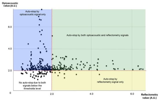 The mean number of initial SRT spots in the SRT group and rescue treatment spots in the crossover group was 17.2 ± 12.1 and 19.6 ± 13.9, respectively. The mean preset pulse of treatment spots and rescue treatment spots was 135.5 ± 22.2 μJ and 139.7 ± 21.7 μJ, respectively (p = 0.553) (range: 115–180 μJ). The mean actually applied pulse energy of treatment spots and rescue treatment spots was 95.5 ± 28.2 μJ and 97.1 ± 30.5 μJ, respectively (p = 0.475). All SRT spot lesions were invisible on CFP during the 12-week follow-up period. Among 379 treatment spots of the SRT group, 10 spots were excluded because of defocusing errors. Evaluation of optoacoustic and reflectometry signals of 369 spots showed that auto-stops occurred in 222 spots (60.1%) by optoacoustic signal, in 9 spots by reflectometry (2.4%), and in 102 spots (27.6%) by both signals. Thirty-six of 369 spots (9.8%) that were below the thresholds of both signals had no auto-stops (Figure 7).