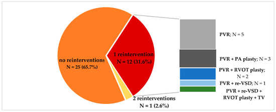 Surgical reinterventions after TOF repair; PVR = pulmonary valve replacement, PA = pulmonary artery; RVOT = right ventricular outflow tract; re-VSD = residual postsurgery ventricular septal defect.