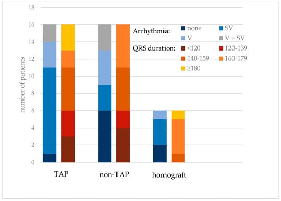 The presence of ventricular and supraventricular arrhythmia along with QRS duration in rTOF patients according to the type of RVOT reconstruction; non-TAP = reconstruction of the right ventricular outflow tract without transannular patch; TAP = transannular patch insertion; SV = supraventricular arrhythmia >0.1% of the recording; V = ventricular arrhythmia >0.1% of the recording; V + SV = both ventricular and supraventricular arrhythmia registered.