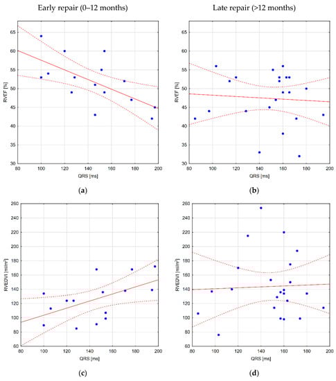 In the analysis of correlations between the results of 24 h Holter ECG and CMR for the whole group, PQ duration corresponded with a right ventricular ejection fraction (RVEF) (r = −0.34), and longer QRS duration was associated with a higher right ventricular end-systolic volume index (RVESVI) (r = 0.32). The measurements of HR variability were not associated with RV size; however, substantial negative correlations were found between two of the HRV indices and pulmonary ejection fraction. Furthermore, there was a substantial correlation of pulmonary regurgitation fraction (PRF), with RVEDVI and RVESVI but not with the ECG parameters. Similarly, older age at CMR was associated with greater RVEDVI and RVESVI but not with greater QRS duration (Table S1). The analysis for distinct subgroups (early versus late correction) revealed significant correlations between QRS duration and RV size in patients after early repair (Figure 3). No additional correlations were found (Tables S2–S4).