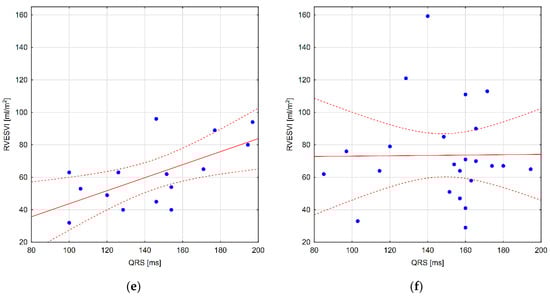 Scatter charts showing the relationship between QRS duration and the CMR parameters: (a) right ventricular ejection fraction (RVEF) in patients after early repair; the Spearman correlation coefficient is significant (r = −0.61); (b) RVEF in patients after late repair; no substantial correlation was observed (p > 0.05); (c) right venricular end-diastolic volume index (RVEDVI) in patients after early repair; the Spearman correlation coefficient is significant (r = 0.56); (d) RVEDVI in patients after late repair; no substantial correlation was observed (p > 0.05) (e) right venricular end-systolic volume index (RVESVI) in patients after early repair; the Spearman correlation coefficient is significant (r = 0.54); (f) RVESVI in patients after late repair; no substantial correlation was observed (p > 0.05). Solid line represents linear regression and the dotted lines stand for regression tolerances.