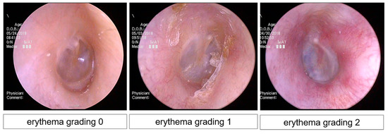 At the initial visit, a structured history of the characteristics of PEAC on the affected side and endoscopic findings of the EAC were obtained. All patients completed a comprehensive questionnaire that included a visual analog scale (VAS), medical history of PEAC, and underlying diseases. We assessed the EAC skin in all patients on the affected side during the initial and final visits. Endoscopic findings were captured from locations where the cartilage, bony, and tympanic membranes were completely visible. Subsequently, an experienced dermatologist (S.C.) blindly assigned a grade to all endoscopic findings based on erythema. Erythema (i.e., subclinical inflammation) was classified according to a three-tiered system depending on gross severity (0, negative; 1, weak positive; 2, strong positive) (Figure 1).