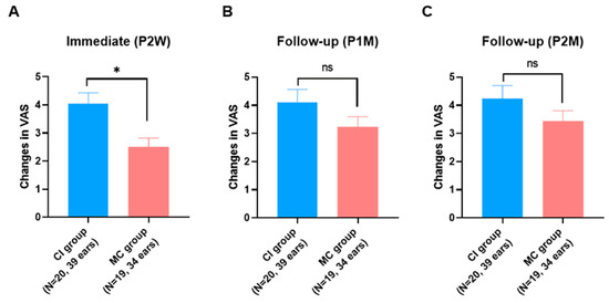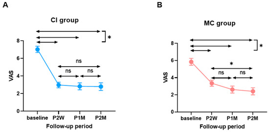 The average pre- and post-treatment subjective symptoms (VAS) in the CI and MC groups are shown in Figure 2. For the CI group, the median pre-treatment VAS score was 7.03 ± 0.36 (range 2–10). The change in the VAS score between the pre- and immediately post-treatment (post-two-week treatment) time points was 4.05 ± 0.38. At the one- and two-month follow-up, the changes in the VAS score were 4.20 ± 0.46 and 4.23 ± 0.47, respectively. In the MC group, the average pre-treatment VAS score was 5.85 ± 0.40 (range 1–10), and the change in the VAS score between the pre-treatment and immediately post-treatment (post two-week treatment) time points was 2.50 ± 0.32. At the one- and two-month follow-up, the changes in the VAS score were 3.23 ± 0.36 and 3.44 ± 0.36, respectively.