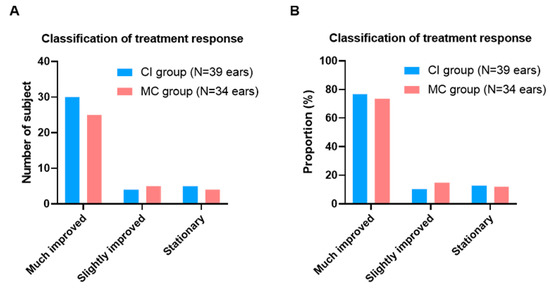 Among the 39 ears in the CI group, 30 (76.9%), 4 (10.3%), and 5 (12.8%) met the criteria for “much improved”, “slightly improved”, and “stationary”, respectively (Figure 4A). The proportion of patients with “rebound” was 3 (10.0%), 2 (50.0%), and 3 (60.0%) in the “much improved”, “slightly improved”, and “stationary” groups, respectively (Figure 4B). No significant differences were noted in the proportion of types of post-treatment subjective outcomes.