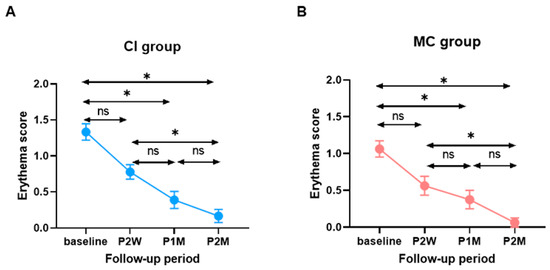 Comparison of erythema score during follow-up periods between the two groups. (A) Within CI group. (B) Within MC group (*: statistical significance, ns: no statistifcal significance).