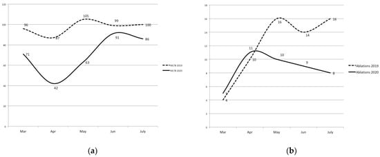 We retrospectively reviewed the registries of our weekly Multidisciplinary Liver Tumor Board (MLTB) to assess the number of patients who were evaluated from March (when the lockdown started) until July 2020 (to include the phase of exiting the lockdown) and compared it with the same period of time in 2019. Our electronic database was searched to assess the number of LDTs performed after MLTB discussion in the same period of time. LDTs included percutaneous ablation, transarterial chemoembolization (TACE) and SIRT.