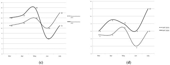 Liver oncologic activity between March and July 2019 and 2020: number of patients discussed at MLTB (a), ablations (b), transarterial chemoembolizations (c) and SIRT (d).