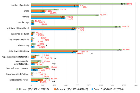 Demographic characteristics of the patients, type of operation and histotype of malignancy, incidences of temporary and permanent hypocalcaemia in the total case series and in the first and second period. Black numbers indicate the number of patients, while red numbers indicate the percentage. Differences between the groups were calculated via the Chi Square, or Fisher’s exact test, when appropriate (both 2-tailed); a p < 0.01 is considered statistically significant. * p < 0.01, ** p< 0.0001.