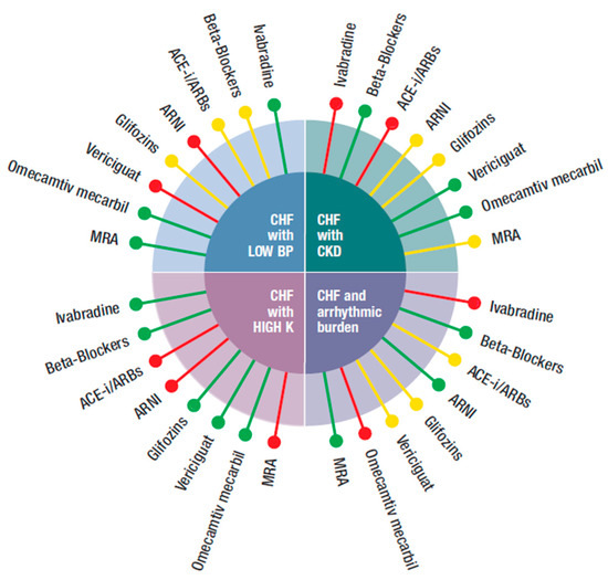 Possible integration of the four new classes of drugs (ARNI, gliflozins, vericiguat, and omecamtiv mecarbil) with the other medications (beta-blockers, ivabradine, ACEi, angiotensin-converting enzyme inhibitor, ARBs, angiotensin receptor blockers, MRA, mineral corticoid receptor antagonist), according to different phenotypes (CHF with: low blood pressure, hyperkalemia, CKD, increased arrhythmic burden) of CHF patients.
