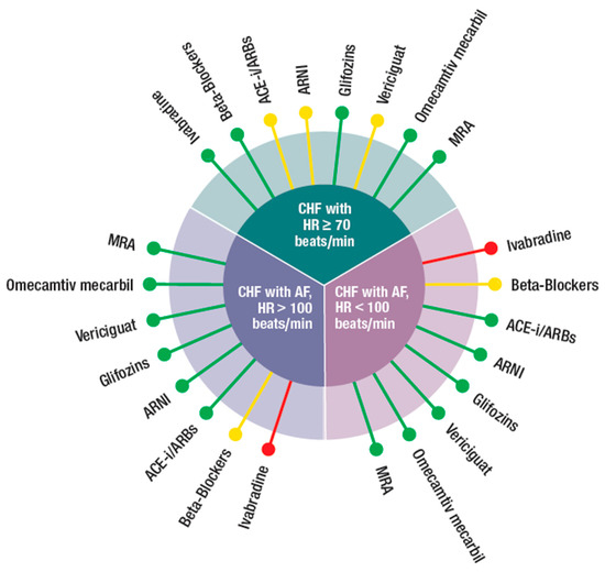 Possible integration of the four new classes of drugs (ARNI, gliflozins, vericiguat, and omecamtiv mecarbil) with the other medications (beta-blockers, ivabradine, ACEi, angiotensin-converting enzyme inhibitor, ARBs, angiotensin receptor blockers, MRA, mineral corticoid receptor antagonist), according to different phenotypes (CHF in sinus rhythm with: HR ≥ 70 beat/min, CHF with AF and HR > 100 or < 100 beats/min) of CHF patients.