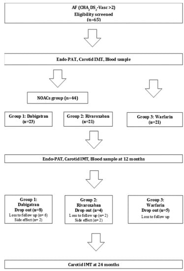 This study was a prospective, randomized, two-year follow-up study to further clarify the efficacy of NOAC in altering endothelial function and atherosclerosis progression in AF patients. The study design is shown in Figure 1. After enrollment, subjects were randomly assigned to the dabigatran group (110 or 150 mg twice/day; group 1), the rivaroxaban group (20 mg/day; group 2), or the warfarin group (controlled by international normalized ratio (INR) of 2–3; group 3). Clinical follow-up occurred at 1, 3, 12, and 24 months. Follow-up was conducted via telephone interviews or office visits. We assumed that NOACs would improve RHI values by an 8% difference, with no significant difference between the two NOACs. The expected difference in RHI was driven by clinical significance and previous medical treatments in other study populations [,,]. To detect a statistically significant difference with a power of 80% with a two-sided α-level of 0.05, a sample of 165 patients (55 patients for each group) would be required. Assuming that the dropout rate would be 20%, the total sample size was set at 198 subjects []. However, due to the aforementioned reasons, it was difficult to enroll patients, and the registration speed slowed down due to the changes in the clinical guidelines and practice. Therefore, an interim analysis was conducted, and the results revealed no significant differences between the NOAC and warfarin groups, so fewer patients were enrolled.