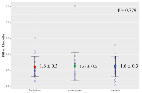 Table 2 presents the RHI and carotid IMT measurements at baseline, 12 months, and 24 months. At baseline, the dabigatran group’s RHI was 1.5 ± 0.4, the rivaroxaban RHI was 1.5 ± 0.4, and the warfarin RHI was 1.6 ± 0.5 (p = 0.487). The left and right carotid IMT was 0.7 mm in the NOAC groups and 0.8 mm (p = 0.697) in the warfarin group. At 12 months, the dabigatran group RHI was 1.6 ± 0.3, the rivaroxaban RHI was 1.6 ± 0.5, and the warfarin RHI was 1.6 ± 0.3 (p = 0.779, Figure 2). Carotid IMT values were not statistically different between the three groups. Notably, the three groups also did not differ statistically with respect to carotid IMT at 24 months.