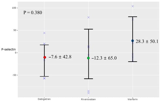In a post hoc analysis of the X-VERT trial, rivaroxaban and warfarin showed similar influences on inflammatory biomarkers, including IL-6 []. Although the researchers found a similar reduction in inflammatory markers, we did not find a meaningful decrease in inflammation biomarkers in both NOAC and warfarin groups. It is possible that the results were different because of differences in the drugs that were used—the previous study only used rivaroxaban. Whereas, rivaroxaban and dabigatran were used in our study. However, in the RIVAL-AF trial, there were no significant differences in the changes in inflammatory cytokines such as IL-6 and TNF-α between the rivaroxaban and dabigatran groups. In a small observational study, a trend (p = 0.06) toward a reduction in P-selectin in the rivaroxaban treatment group compared to the control group was noted []. Our study also found a trend of reduced P-selectin level in NOAC-treated patients compared to warfarin-treated patients. The clinical significance of this finding is still unclear, thus further studies are needed. There are several other reasons why our results showed no significant differences. Firstly, previous animal studies administered higher doses of NOAC compared to the amount that was used in our study [,]. Secondly, our study was a small trial conducted over a short time period, and thus may not provide robust temporal statistical evidence.