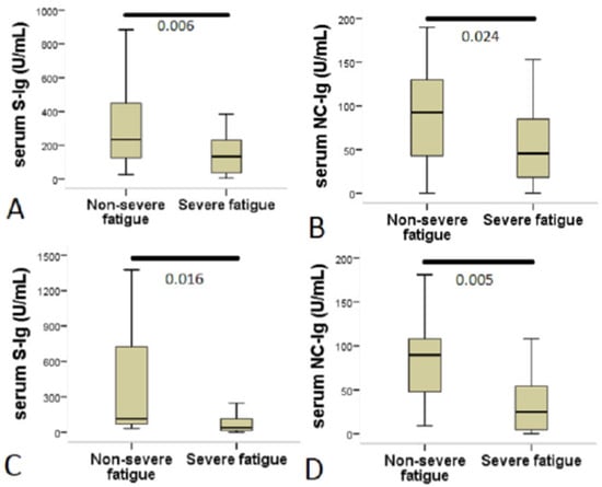 Patients with severe fatigue showed decreased serum anti-SARS-CoV-2 antibody levels. The figure shows a comparison of anti-SARS-CoV-2 antibody levels between patients with non-severe fatigue and those with severe fatigue. The Chalder fatigue scale (CFQ-11) was used to assess fatigue and to create a case definition for severe fatigue; a bimodal scoring system was used ranging from 0 to 11. A score of 4 or more indicated caseness (severe fatigue). (A,C) Serum anti-SARS-CoV-2 spike IgA + IgM + IgG levels (S-Ig). (B,D) Serum anti-SARS-CoV-2 nucleocapsid IgA + IgM + IgG levels (NC-Ig). Statistical analysis was performed using Mann–Whitney U test.