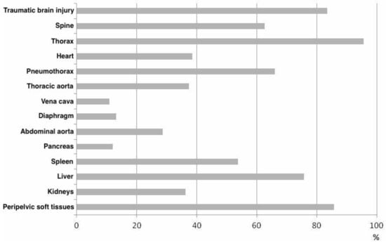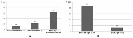In contrast, data from recent years show that high-altitude falls account for an average of only 20–25% of trauma patient deaths [26,27]. Traffic accidents, to which rollover traumas from trains have often been added, are shown to cause death more frequently, up to 72%, especially in less densely populated areas [27,28].