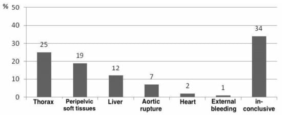 The leading sources of bleeding were thoracic, followed by peripelvic bleeding, hemorrhage of the liver, aortic rupture, and destruction of the heart. External sources of bleeding—due to transfemoral amputation—occurred in only one case. In 34% of the patients, a clear assignment of the main source of bleeding was not possible during autopsy due to multiple injuries (Figure 4).